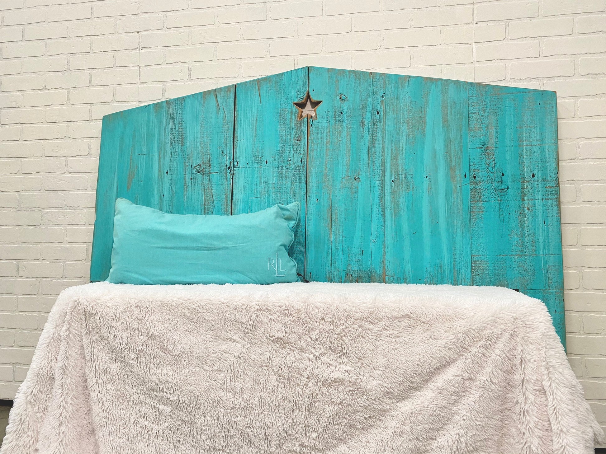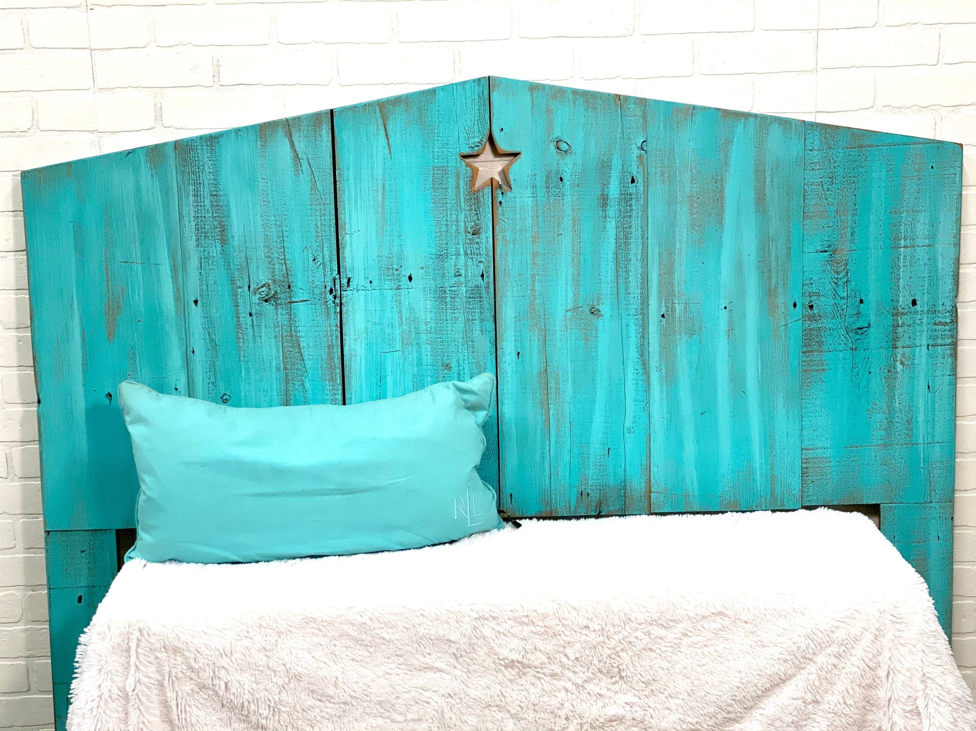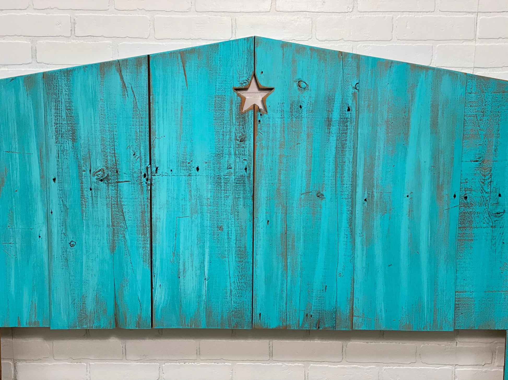 This beach sea life inspired headboard is handcrafted from recycled wood given a color wash of sea blue/green to give a beachy seaside soothing feel accented by a star cutout.